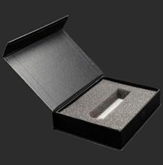 Boite PVC rigide individuelle , adaptée aux "stylos USB", capot transparent, fermeture par aimant, intérieur mousse blanche découpée à la forme du stylo